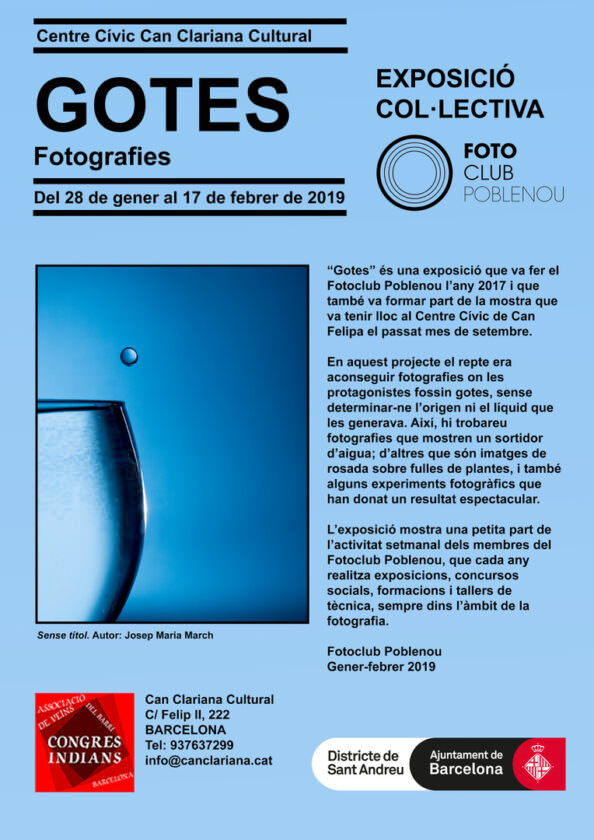A continuació us presentem les 36 fotografies de gotes fetes per 19 fotògrafs socis del Fotoclub Poblenou, exposades al Casal de Barri del Poblenou l’any 2017.