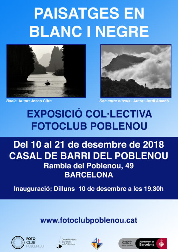 A continuació us presentem les 43 fotografies de paisatges en blanc i negre fetes per 22 fotògrafs socis del Fotoclub Poblenou, exposades al Casal de Barri del Poblenou del 10 al 21 de desembre de 2018.