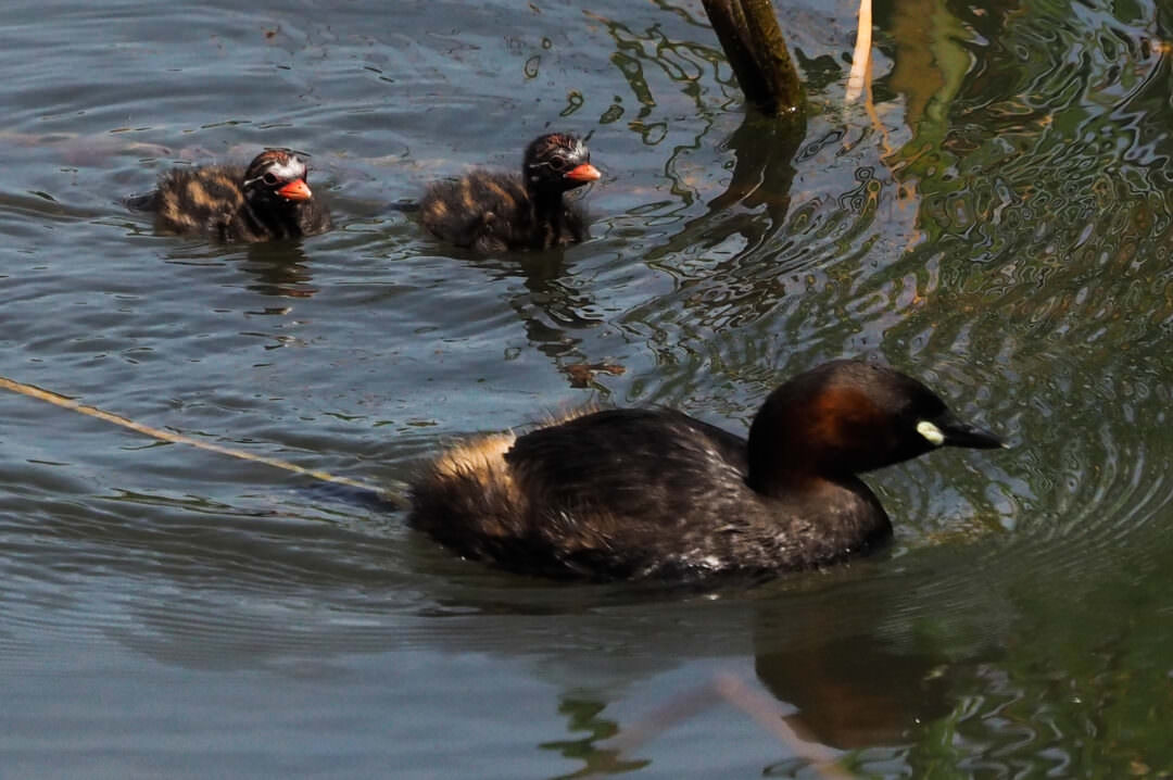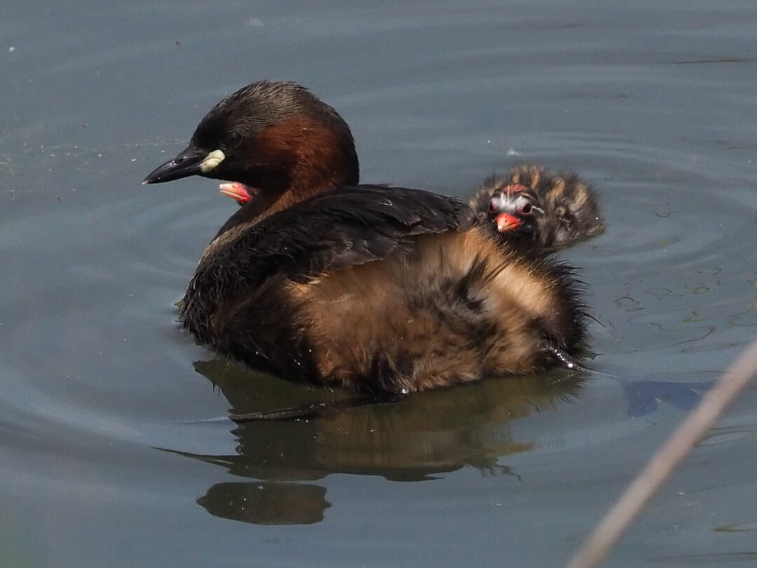 Vaig fer aquesta fotografia després d’observar el cabusset dins l’aigua. Em vaig adonar que alguna cosa es bellugava sobre el seu llom i van resultar ser dues cries a les quals la mare va fer baixar a l’aigua.