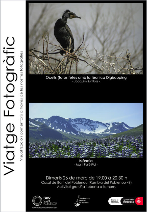 Ocells (fotos fetes amb la tècnica digiscoping), presentat per Joaquim Surribas. El fotodigiscoping és la tècnica fotogràfica que consisteix a acoblar una càmera fotogràfica a un telescopi terrestre per aconseguir així una potència de focal que permet fotografiar a llarga distància. S’utilitza per fotografiar especialment fauna, i va fer-se famosa per la fotografia d’ocells. Totes les fotografies d’ocells que podeu veure estan fetes com a mínim a 150 metres de distància.